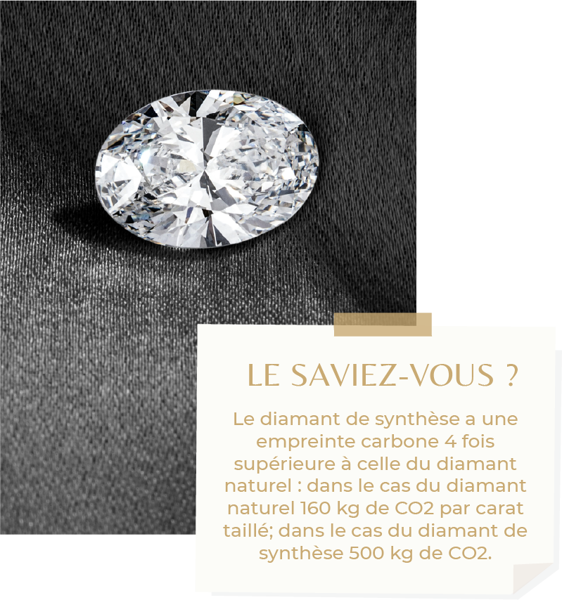 Le diamant naturel et le diamant de laboratoire diffèrent principalement par leur origine, mais partagent des caractéristiques étonnamment similaires. Le diamant naturel se forme naturellement dans les profondeurs de la Terre ce qui fait sa rareté alors que le diamant de synthèse est créé en laboratoire à l'aide de technologies avancées qui reproduisent les conditions naturelles de manière accélérée et qui nécessite une quantité importante d'énergie.
