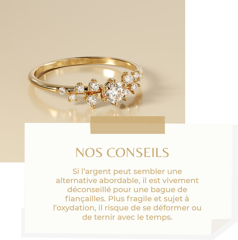 Le métal de votre bague de fiançailles joue un rôle essentiel, tant pour son esthétique que pour sa longévité. Les métaux précieux à privilégier sont l’or jaune, l’or blanc et l’or rose tous raffinés, résistants et conçus pour traverser le temps avec éclat.