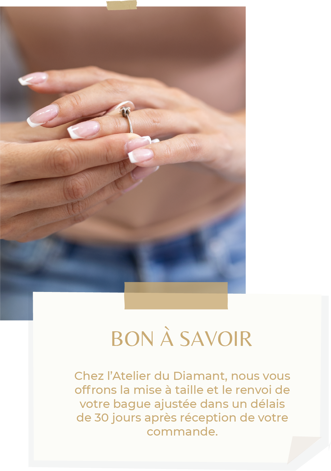 À la maison avec baguier : Chez Atelier du Diamant, nous vous pouvez vous demander l’envoi d’un baguier directement à domicile pour mesurer votre taille de doigts professionnelle, même à la maison.