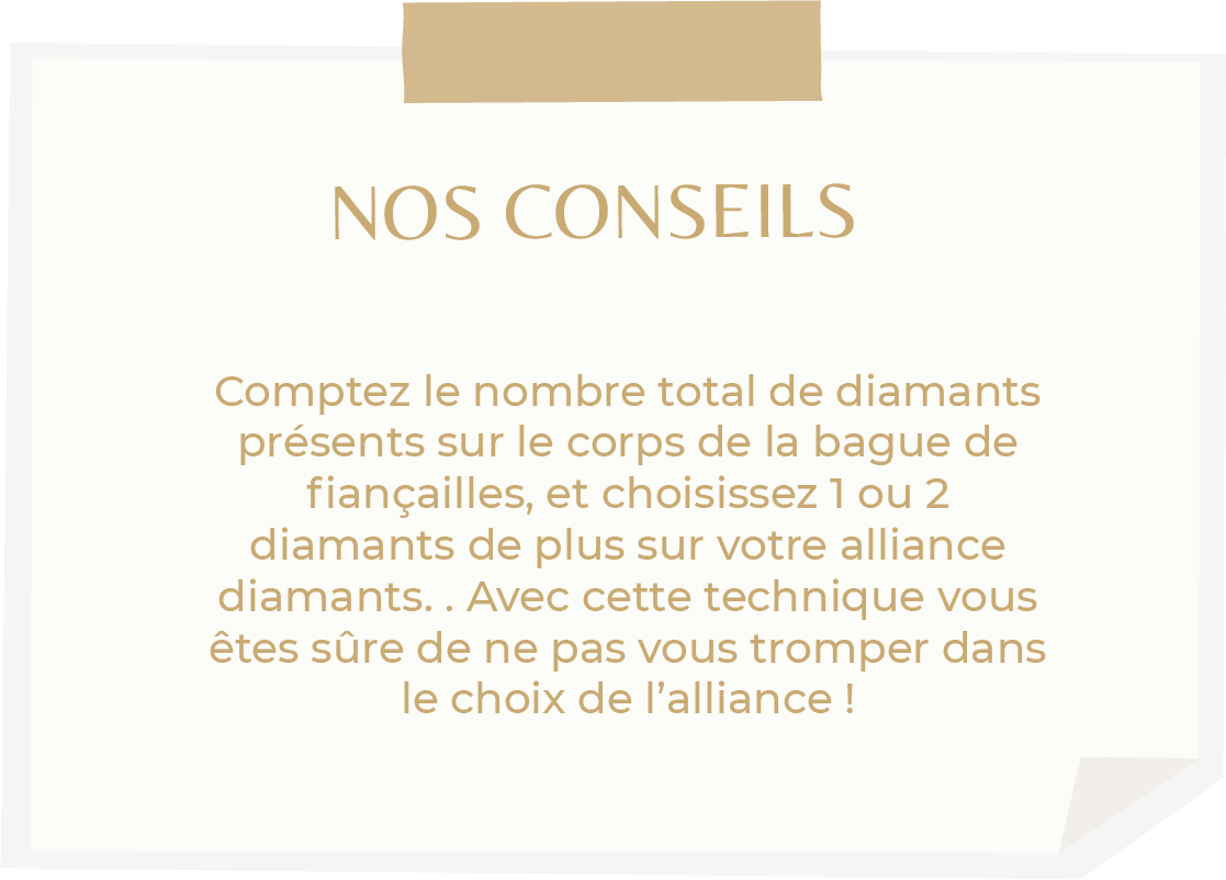 - Pour celles qui ont un solitaire accompagné et/ou entourage, il faut toujours veiller à garder une largeur similaire entre la largeur de l’alliance et du corps de bague, un style de sertissage commun ainsi que des diamants de dimensions similaires. Enfin, il faut également que le nombre de diamants soit plus ou moins équivalent entre l’alliance et le solitaire.