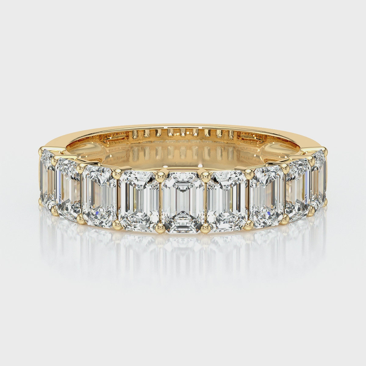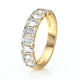 Sublimée par une ligne harmonieuse de diamants taille émeraude, cette alliance en or 18 carats séduit par son élégance graphique et son éclat raffiné. Les facettes larges de chaque pierre révèlent une lumière profonde et régulière, apportant au bijou un style à la fois moderne et intemporel.