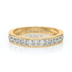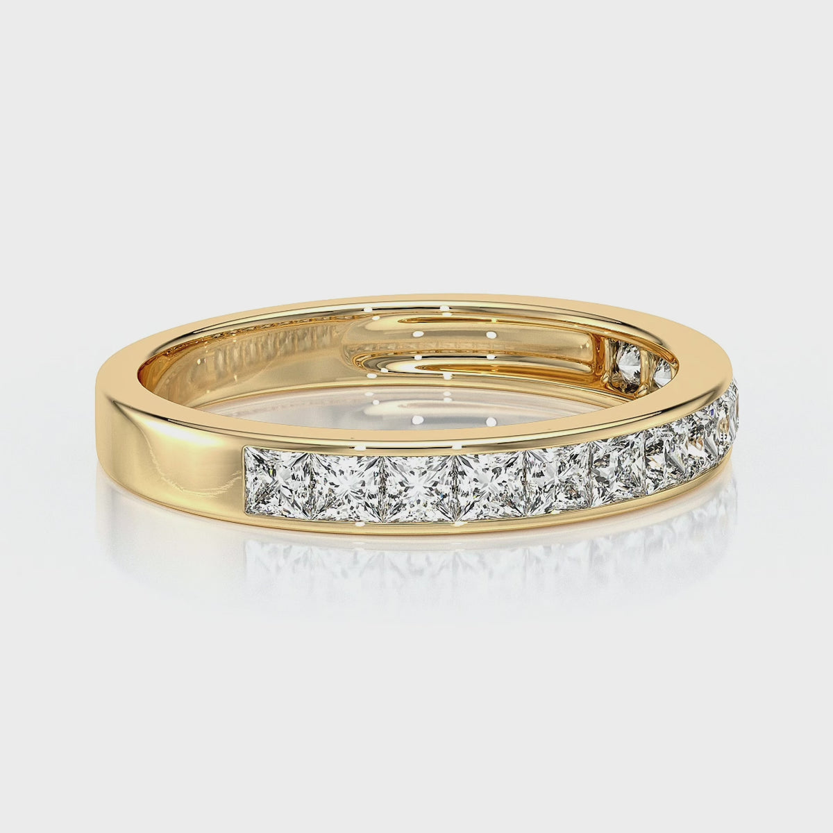 Cette alliance en or 18 carats est ornée d’une ligne élégante de diamants taille princesse, dont les facettes éclatantes diffusent une lumière intense et régulière. Le sertissage en rail met en valeur la pureté des pierres et crée un ruban de brillance continu autour du doigt.