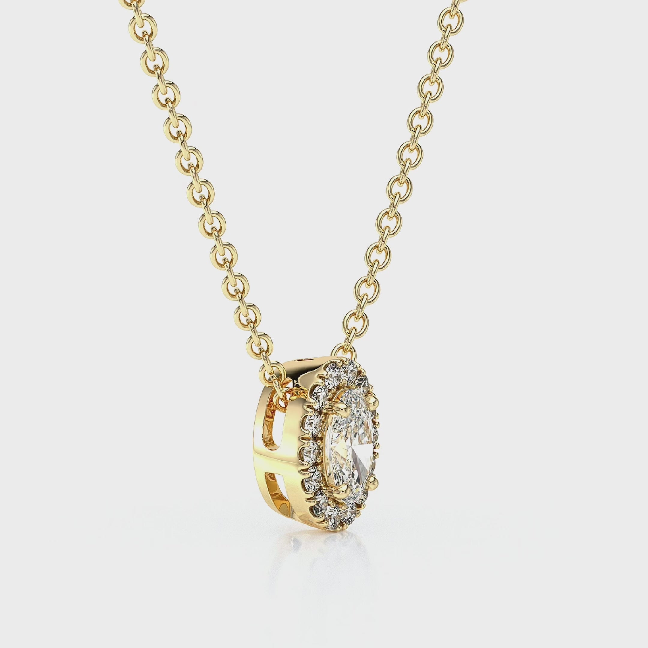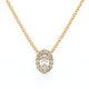 Majestueux et lumineux : en or 18 carats, une pierre ovale sertie 4 griffes est soulignée d’un halo de diamants — un « îlot » pétillant qui éclaire le décolleté au quotidien comme lors des grands instants.