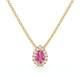 Majestueux et éclatant : en or 18 carats, le saphir rose naturel central taille poire sertie 3 griffes est sublimée par un halo de diamants — un « îlot » de lumière pensé pour le quotidien comme pour les grands moments.