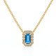 En or 18 carats, un pendentif au dessin intemporel : topaze naturelle taille émeraude sertie 4 griffes, entourée d’un halo de diamants pour un éclat équilibré — imaginé et fabriqué en France.