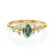 Léger, floral et aérien ! Ce superbe solitaire accompagné saphir vert et diamant est tout à fait singulier de part sa structure et la disposition de ses diamants. Cette pièce en Or 18 Carats est une véritable merveille, raffinée et élégante avec son saphir vert central en forme ovale.